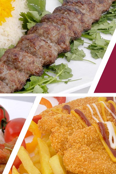 100 گرم سینه مرغ تازه مزه دار شده+80 گرم فیله گوساله مزه دار شده+1 عدد گوجه فرنگی کبابی+300 گرم برنج ایرانی اعلا